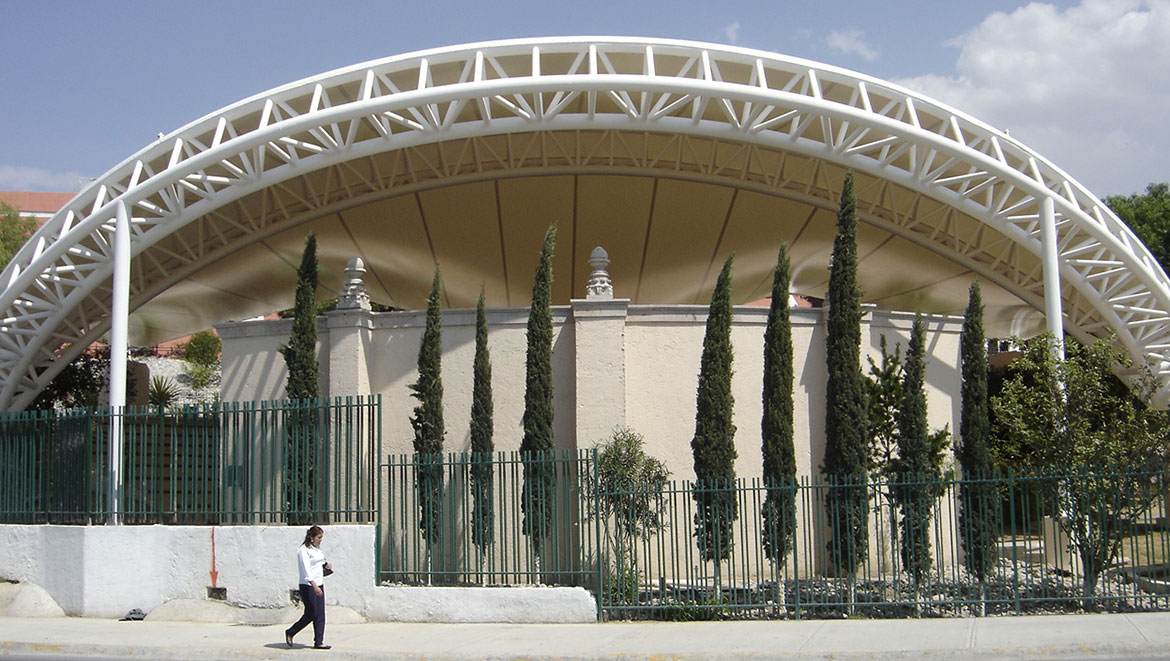 Cimentación a base de zapatas aisladas soportando mástiles, cables de acero, arcos de armaduras tridimensionales con largueros de 10” de cédula 60 (uno de ellos trabajando en cantiléver - 27 toneladas de acero), cubierta de membrana arquitectónica estructural recubierta con PVDF (marca Verseidag).